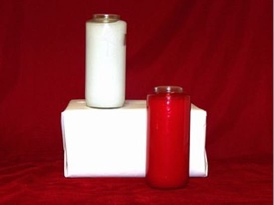 Available in clear or red glass container with an embossed cross