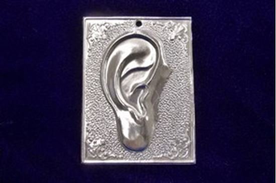 A small metal (silver or gold) rectangle, called a tama or an aphieroma, embossed with a facsimile of an ear to be placed on the church altar or in front of the church icons. A tama combines a personal prayer and a vow to a saint while appealing for help or assistance. The petitioner vows to give or do something as he/she prays to a saint in times of need